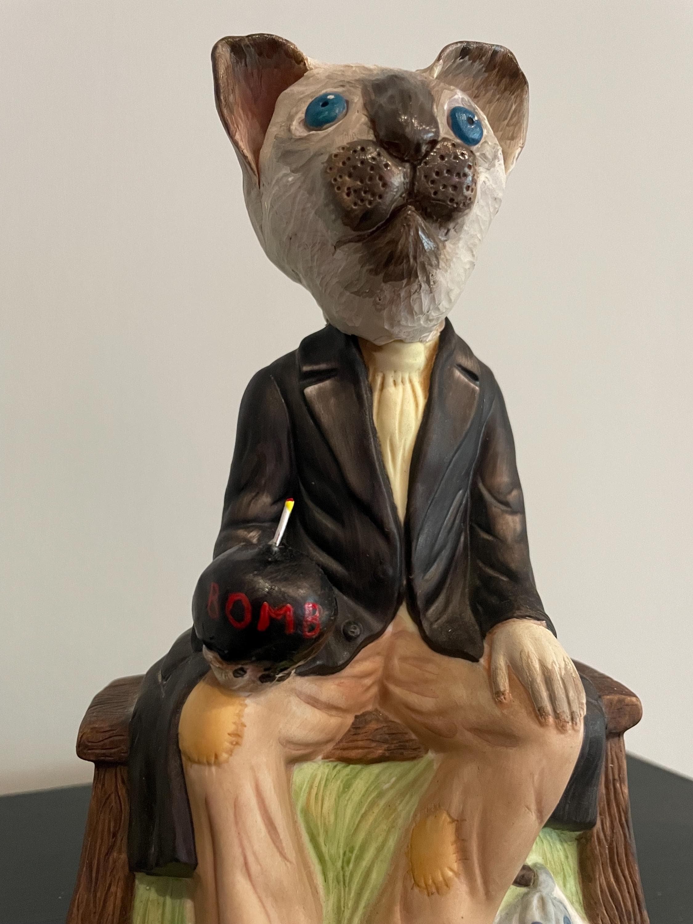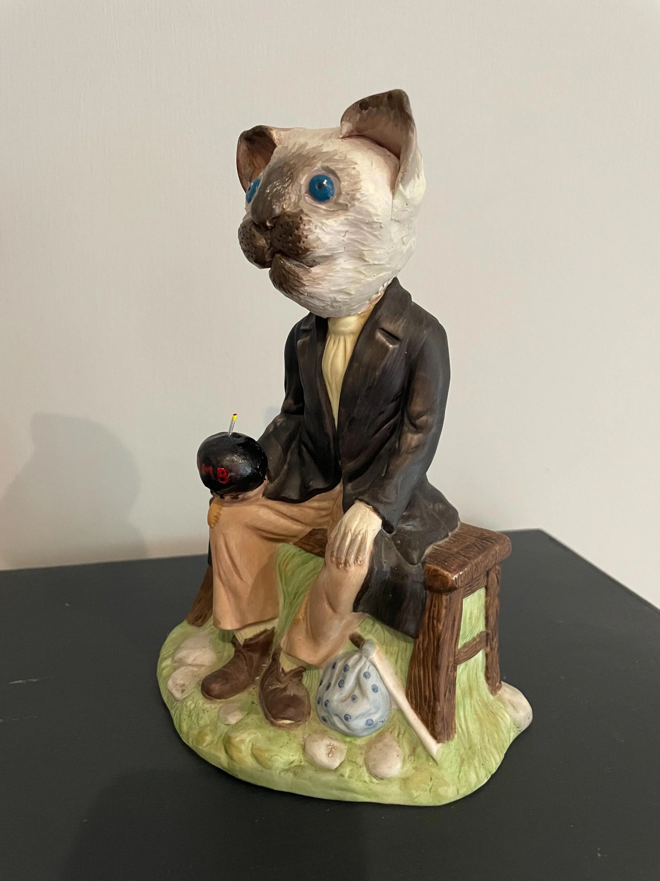 This is a charity shop statue of a weary traveller that I have upcycled with clay and paint. It is now a Siamese alley cat, down on his luck, and about to cross a moral threshold. It measures roughly 14cm x 11cm x 20cm.